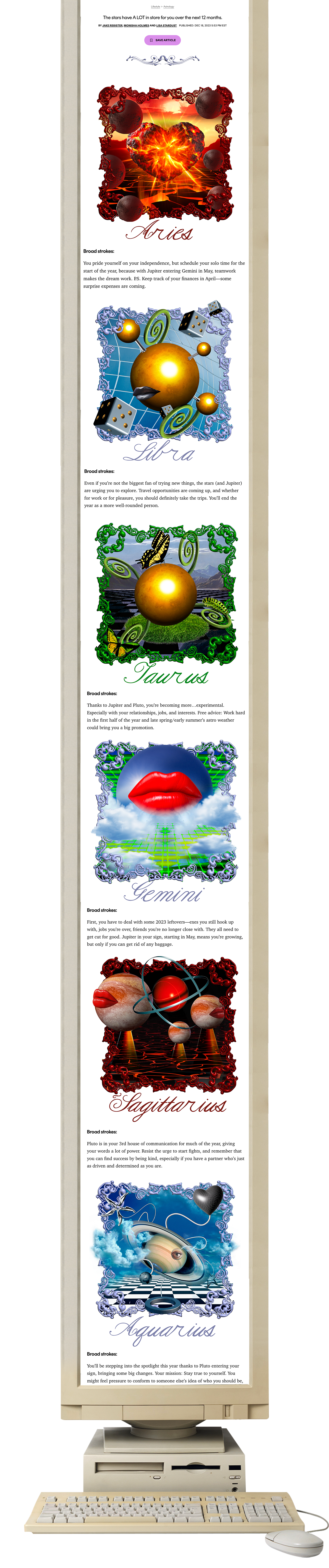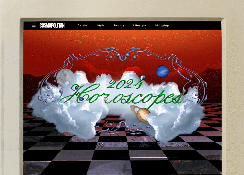 COSMOPOLITAN Mag: I rebranded and set the art style for the astrology digital column. I create all daily art and packages for the digital stories. This includes type, collage, and motion graphics.